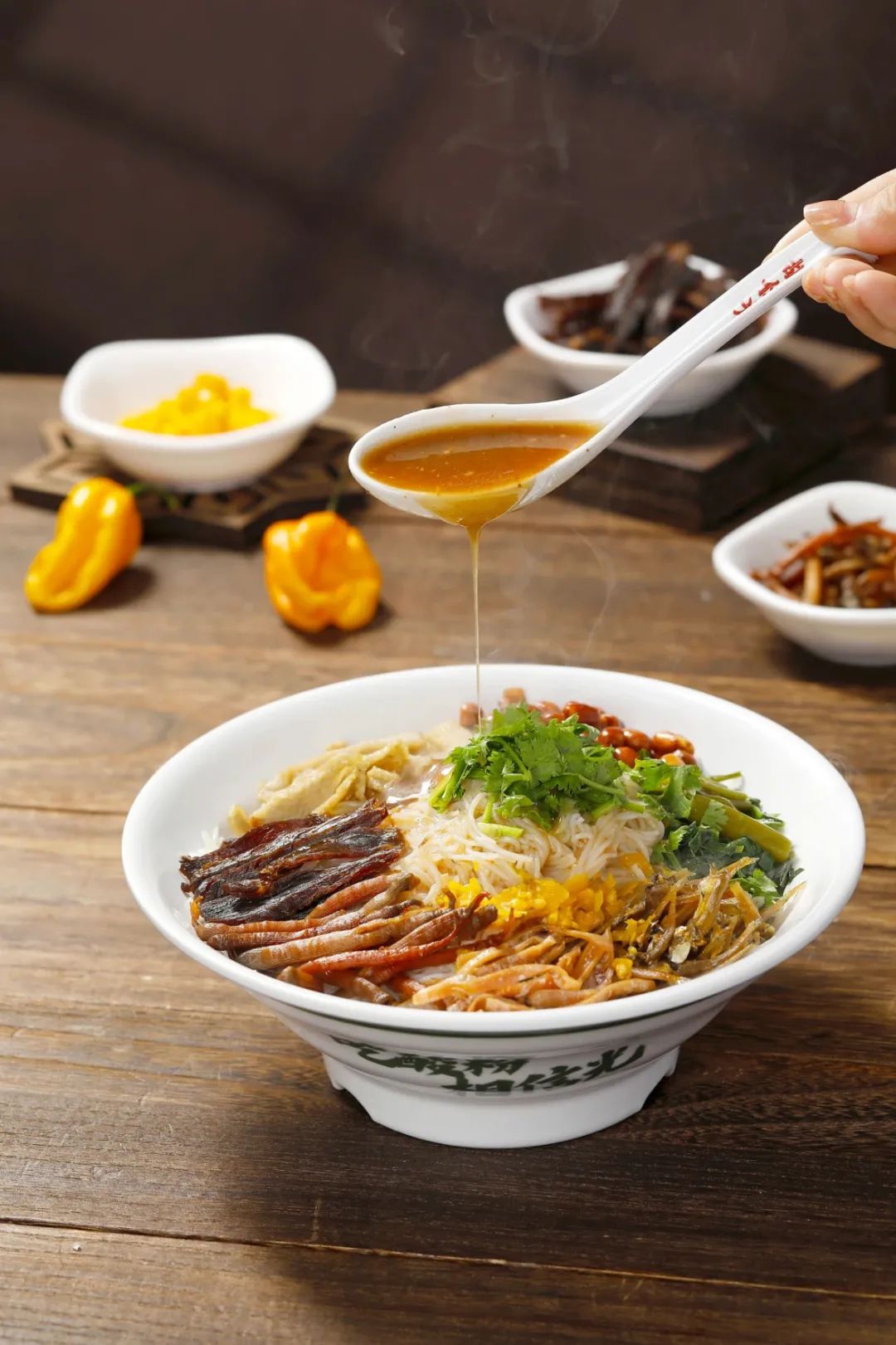 细米粉埋进酸笋炸弹阵,花生脆、肉干香、豆芽鲜在酸辣卤汁里缠斗!嗦粉时当心——酸笋的”生化进犯”正潜伏在柔滑米粉间,参加海南特征黄灯笼辣椒,一口入魂酸辣上头!