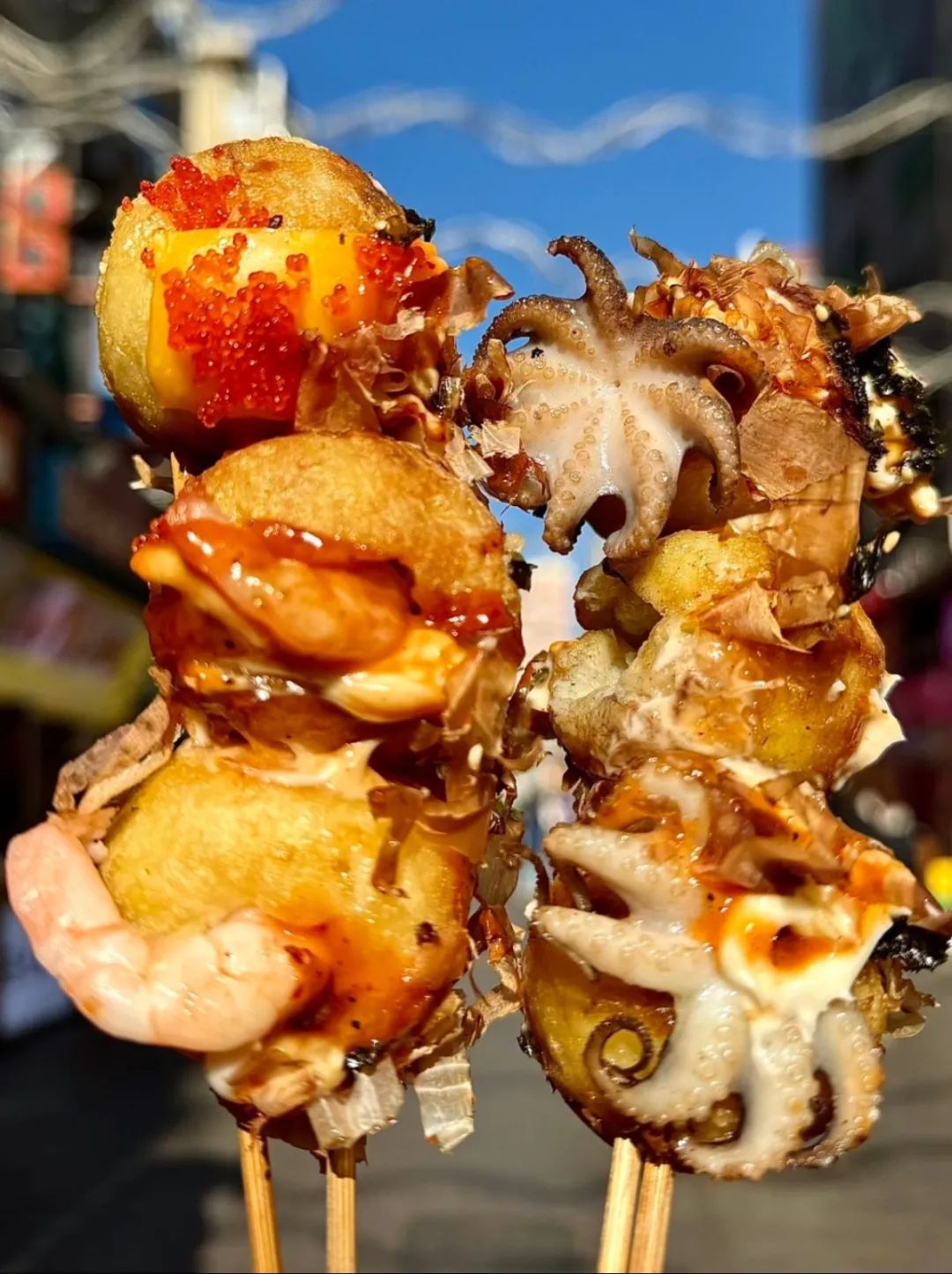 面糊裹着大块章鱼肉在铁盘翻滚,木鱼花随热浪妖娆起舞!戳破酥壳的瞬间,芝士岩浆裹着Q弹章鱼喷涌,海苔碎在舌尖噼啪炸响——主张闭眼吃,幸福感会加倍!