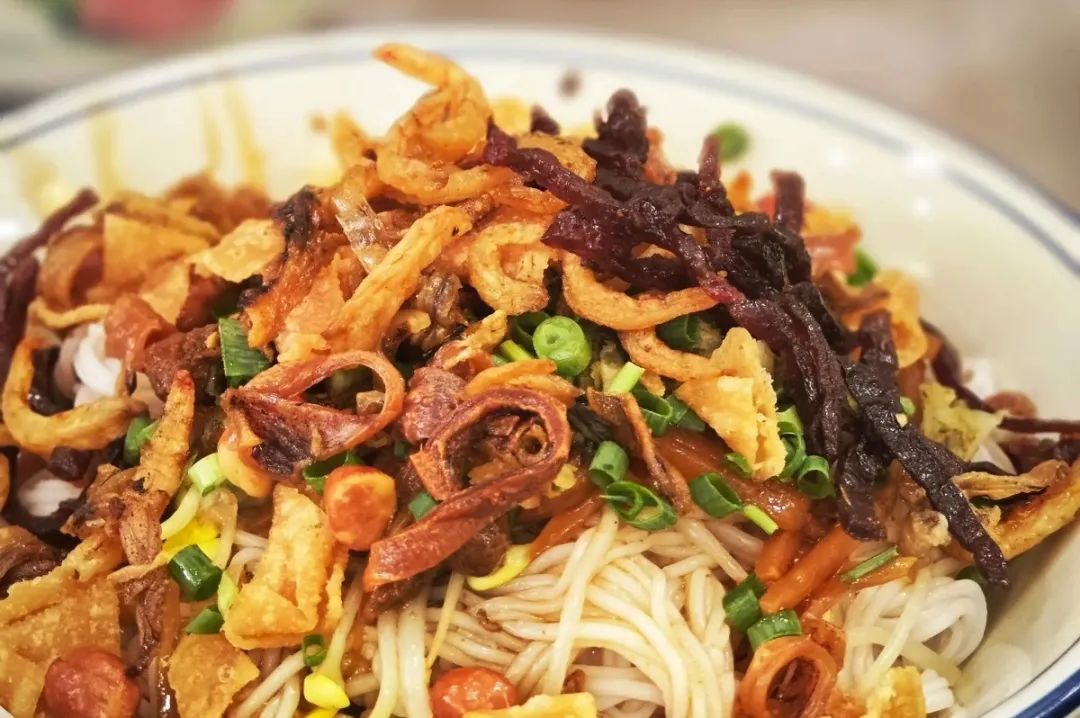 尝一口陵水酸粉,卤汁的浑厚酸香首先唤醒味蕾,清新开胃;小鱼干、鱼饼、沙虫开释的浓郁海味与牛肉干的陆地醇香完美交错;花生米的酥脆、鱿鱼丝的干劲带来丰厚的口感体会;米醋的天然清甜在酸后悄然回甘;黄灯笼椒的温顺炽烈点着热心,适可而止……