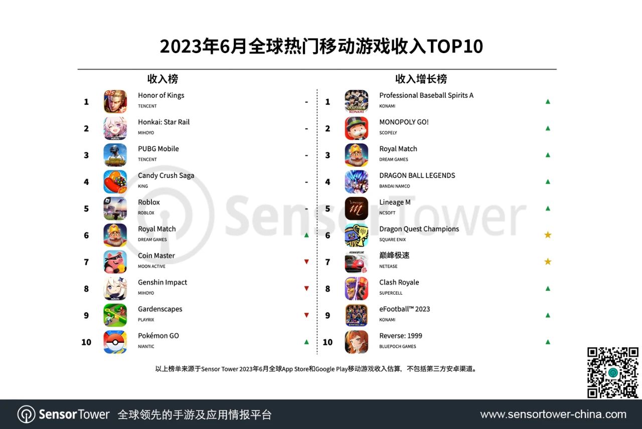 依据 Sensor Tower 发布的商铺情报数据,2023年6月腾讯《王者荣耀》在全球 App Store 和 Google Play 吸金2.13亿美元,连任全球手游热销榜冠军。6月27日,该游戏推出新版别,引入了新英豪亚连、新赛季和新系统等,进一步稳固其热销榜冠军方位。(阐明:数据不包括第三方安卓途径)
